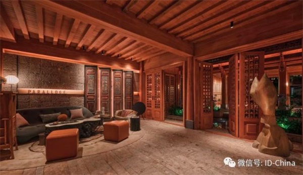 前厅是一个与客人们交流的空间,沙发背景是原建筑过厅的门扇。木匠雕塑的兔子源自丽江当地一个古老的传说。当地铜匠手打的椅子和接待台与各种当代家具融为